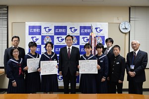 11月24日(火曜日)、広野中学校女子剣道部が広野町役場を訪れ、11月14日(土曜日)いわき市で開催された第36回中学校選抜剣道大会において女子団体戦2年連続で優勝、女子個人で井上愛海さんが優勝、根本藍さんが3位に入賞したことを遠藤町長と根本教育長に報告しました。主将の根本藍さんは、「一致団結して広野中のチームワークを発揮することで優勝することができました。」と笑顔で喜びを話しました。