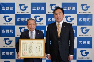 11月17日(火曜日)、富岡地区防犯指導隊広野分隊副隊長の根本一夫さんが広野町役場を訪れ、令和2年全国地域安全運動県表彰に係る特別功労者表彰を受賞したことを遠藤町長に報告しました。今回の受賞は、長年の防犯指導隊としての功績ならびに震災以降、広野町鳥獣被害対策実施隊の隊長として有害鳥獣の捕獲にいち早く取り組み、避難住民の帰還促進に寄与したことなどが評価されたものです。特別功労者表彰は平成30年に創設されたもので、広野町では初めての受賞となります。