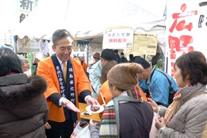 1月24日(土曜日)、25日(日曜日)の2日間、静岡県伊東市で第21回伊東温泉めちゃくちゃ市が開催され、広野町は新鮮野菜の販売ブースを出店するとともに、広野産の餅米を使ったつきたて餅の無料配布を行いました。初日の24日は、遠藤町長自ら餅をつき、来場者に餅を振る舞いました。伊東市とは震災直後の平成23年7月28日に災害時の相互応援協定を締結しており、町は継続的な支援に対する感謝と、農産物に対する風評被害を解消するため、この催し物に毎年参加しています。
