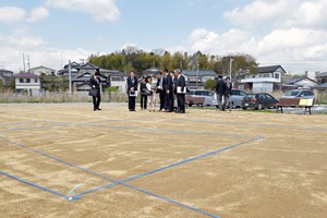 4月24日(金曜日)、文化庁の有松育子次長が広野町を訪れ、町内大字下浅見川字桜田地内の桜田Ⅳ遺跡を視察しました。これは、災害公営住宅・広野原団地の造成工事中に発見したもので、発掘調査したところ続日本紀(しょくにほんぎ)に記述のある駅家(うまや)の可能性があるため、遺跡の一部を公園として保存したものです。