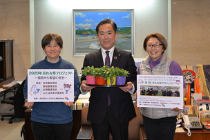 3月9日(月曜日)、一般社団法人ほのぼの運動協議会が広野町役場を訪れ、ワスレナグサを寄贈しました。当協議会は、東日本大震災の被災地へ活動支援金、寄付金などの支援イベントを実施しており、今回寄贈されたワスレナグサは、ふたば未来学園高校、磐城農業高校、会津農林高校、岩瀬農業高校の生徒が震災支援への感謝と震災を忘れないでという未来への願いを込めて育てたものです。ワスレナグサは、広野町・楢葉町・浪江町の各町に400鉢ずつ寄贈され、3町を代表し、作間由美子事務局長から遠藤町長にワスレナグサが手渡されました。